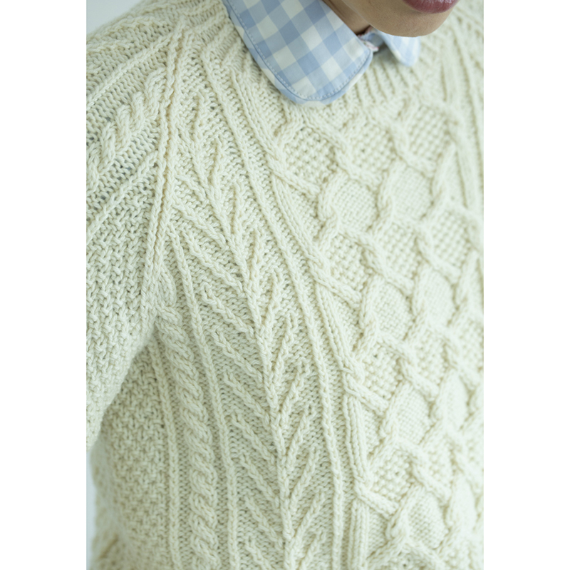 身頃の中心に入れたダイヤ模様、ねじり目交差の生命の木、ケーブルなどを組み合わせた定番シルエットのラグランセーターです。