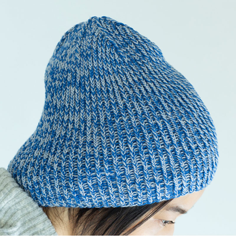 ねじり1目ゴム編みが生きるよう、単色2本どりの赤と、色の組み合わせを楽しめるブルーとグレーを2本どりにした杢調タイプ。トップはねじり目をきれいに立てて、3目一度の減目をします。