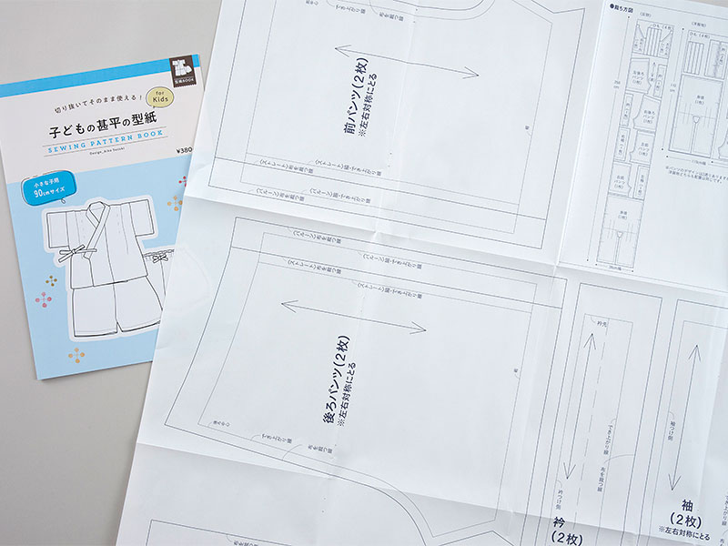 90cmサイズの小さな子用の甚平です。パンツはストレートタイプと裾にゴムを入れたバルーンタイプの2通りが作れます。手ぬぐい生地や表面がでこぼこに加工したリップルやサッカー、楊柳などを選ぶと夏を涼やかに過ごせます。モデル身長(左から):92cm、87cm