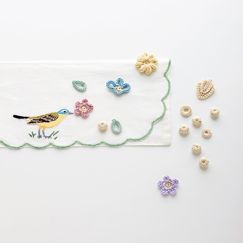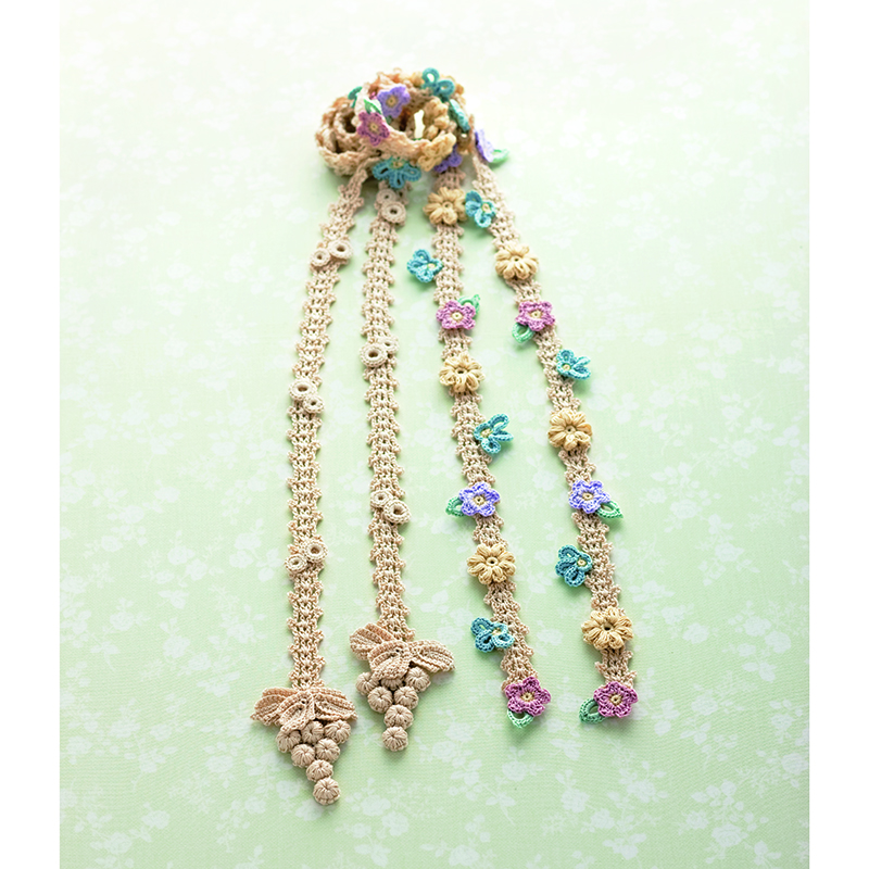 ナチュラルカラーのラリエットは、アイリッシュレースらしいブドウのモチーフをリボンの先につけました。小花のラリエットには、淡いパステルカラーのモチーフを散らして可愛らしさをアピールします。小さく可憐なモチーフは1,2段で完成するようにと工夫しました。
