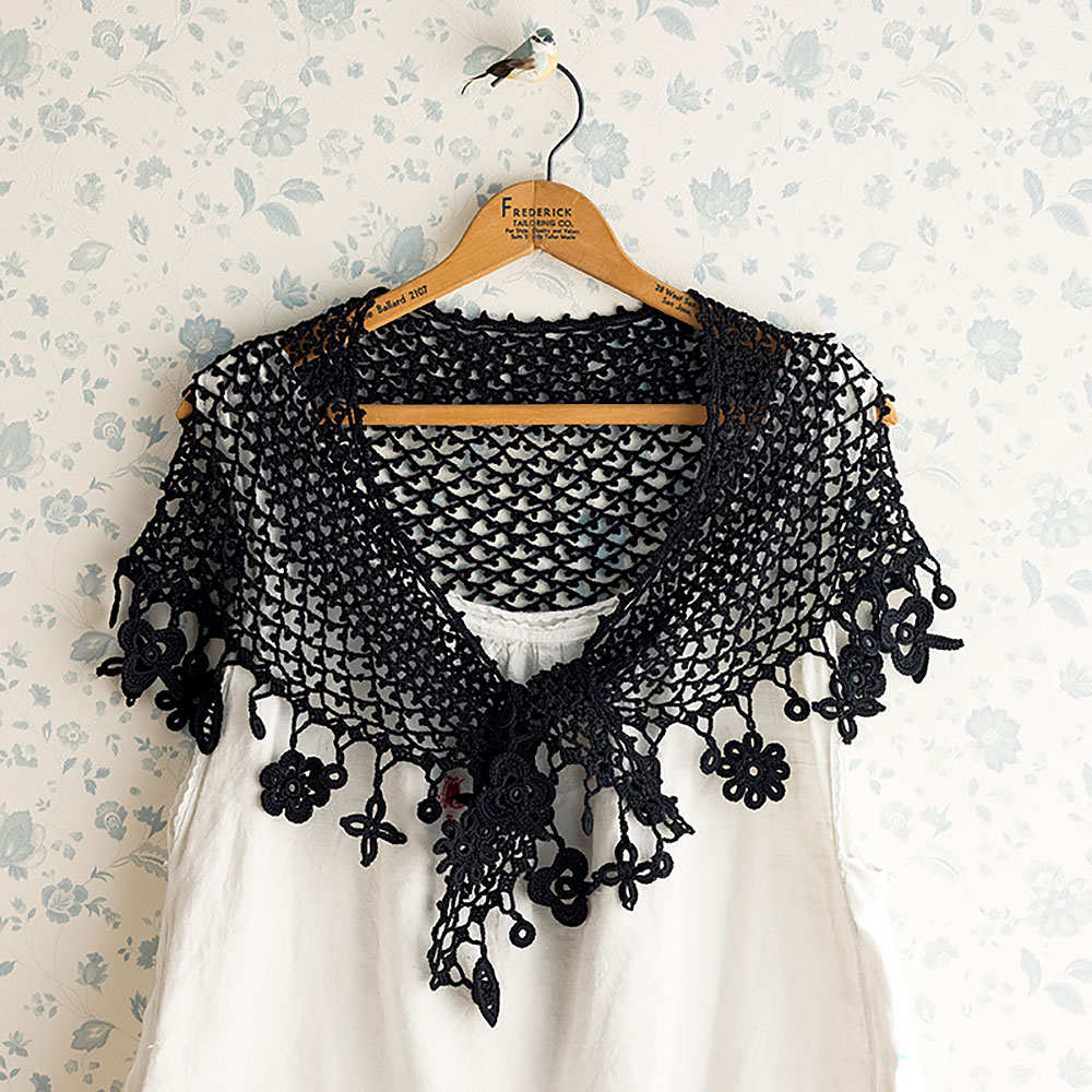 ピコットをあしらった大きなネット編みショールは使いやすい三日月形のシルエットに。フリンジのようにモチーフをさげて、揺れる可愛らしさを表現しました。立体モチーフでは表と裏の表情の違いが気になるので、なるべく平らなモチーフを使用します。