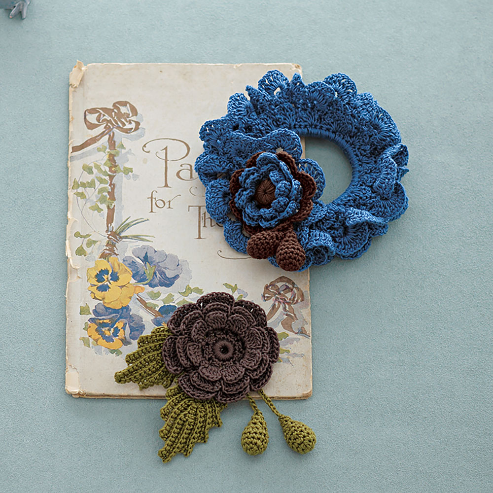 材料:オリムパス エミーグランデ シュシュ:あい色(335)20g、〈ハーブス〉茶色(777) 5g。ヘアゴム。 コサージュ:グレイッシュブラウン(739)10g、モス グリーン(288)5g。ブローチピン。