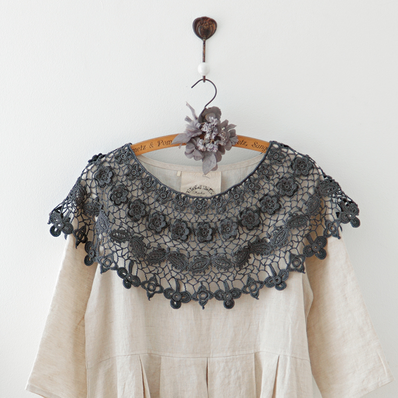 モチーフを横につないだケープはダークな色目でまとめました。ナチュラル系を選べば乙女な印象に。