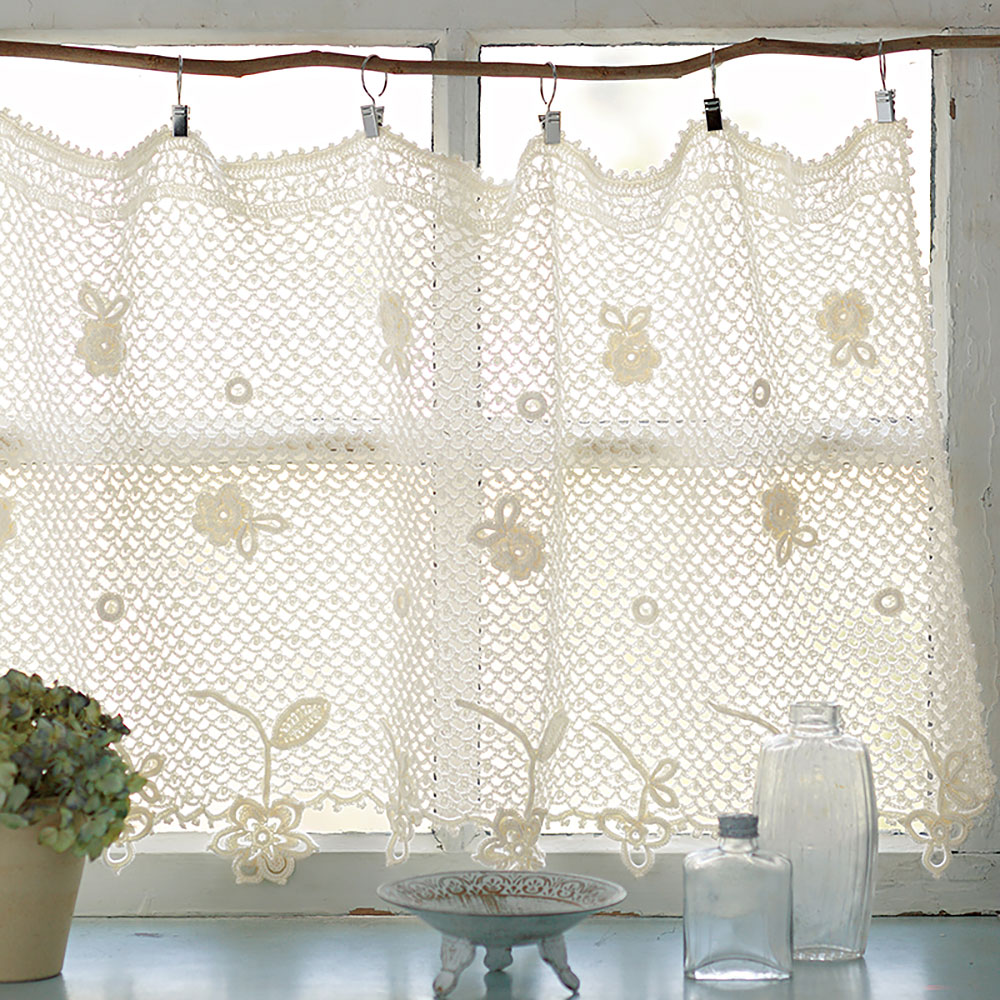 窓辺に手づくりのカフェカーテンを。裾のモチーフがアイリッシュらしさを強調します。ストールとしてもどうぞ。