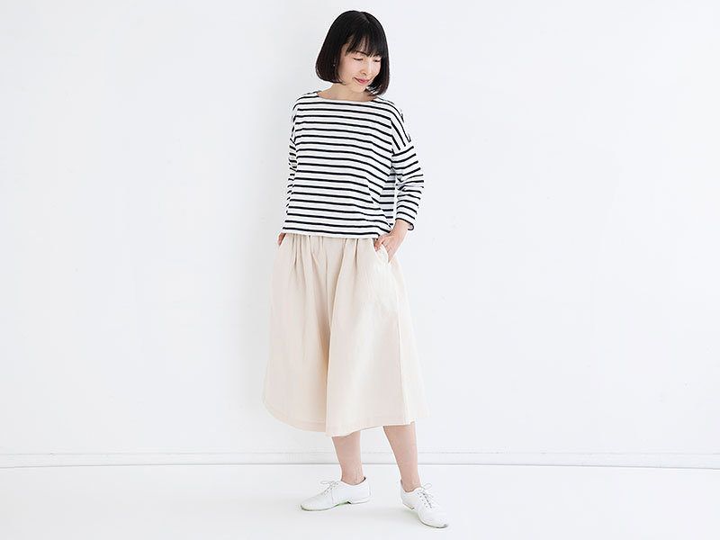 たっぷりとギャザーの寄ったパンツは、一見スカートのよう。