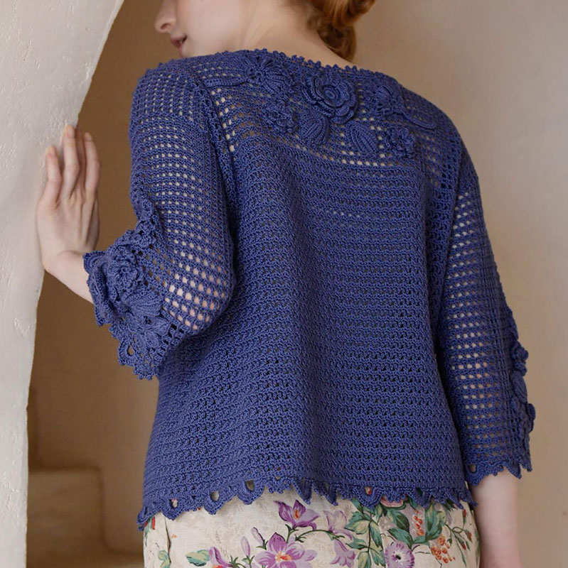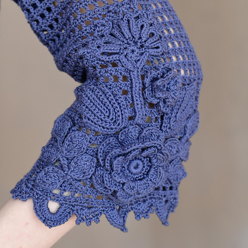 シンプルなベースに、アイリッシュクロッシェのモチーフをたっぷりとトッピング。袖口や後ろ姿まで気を抜きません。ボリュームのある花、可憐な花、横からのシルエット、葉っぱ…。モチーフの種類や数、配置はお好みでアレンジ可能です。ドレッシーな服と合わせるとぐっとエレガントな雰囲気になります。