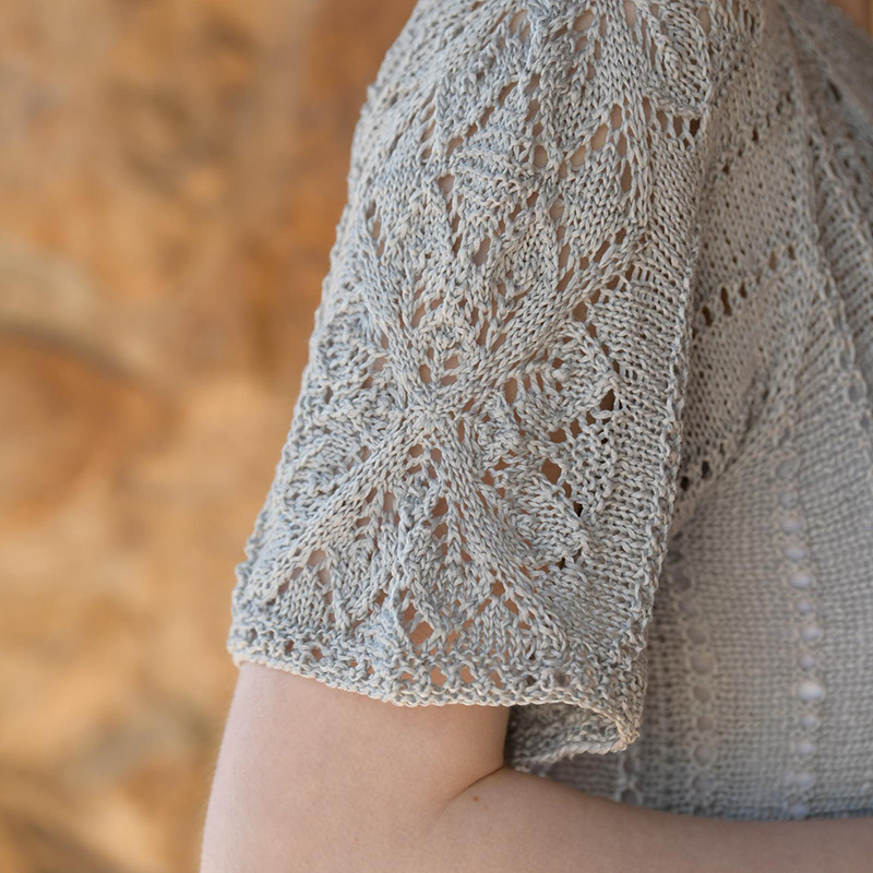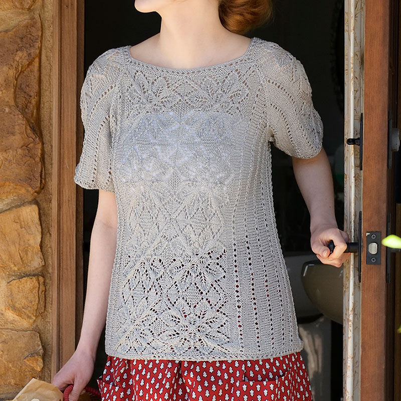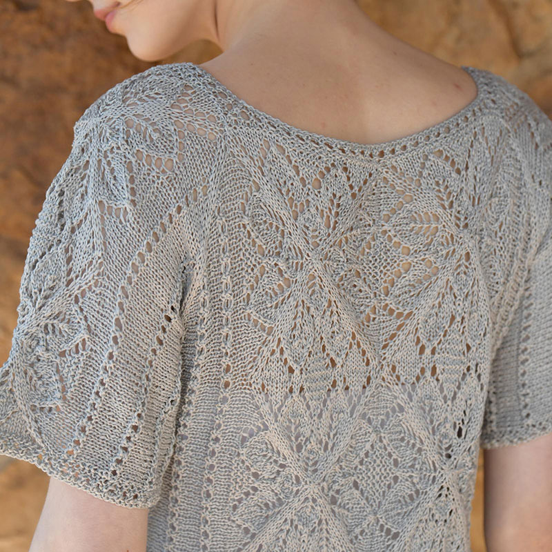 クンストレースのモチーフをパネル状にはめ込んだプルオーバー。棒針で編むのでモチーフをつないでもすっきりと薄く仕上がり、クロッシェレースとはまた違う繊細な美しさが魅力です。モチーフ以外の編み地はごくごく