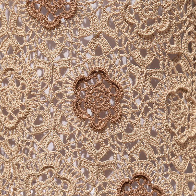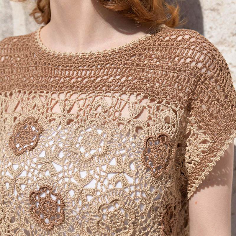 花びらの一部が立ち上がった、表情のあるモチーフつなぎ。シンプルな形に濃淡でアクセントをつけて。モチーフの一部に濃いめの色を使うことで全体の印象がぐっと締まります。品のいいアースカラーは、夏のリゾートにもぴったりです。
