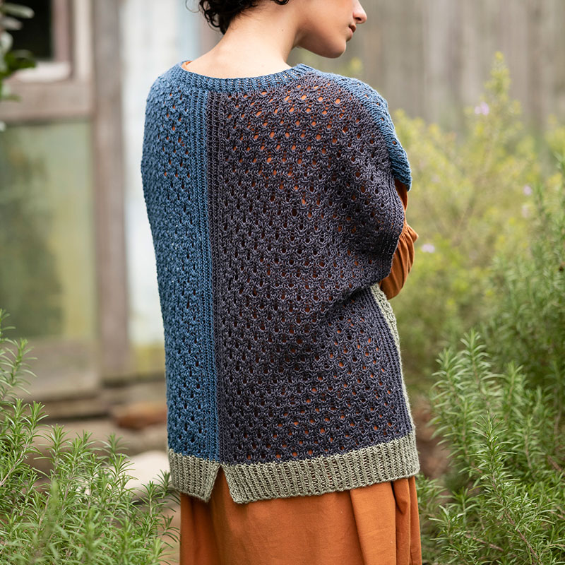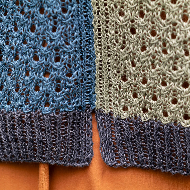 材料:ておりや オリジナルリネン 灰味青(21)225g、灰味緑(12)・チャコールグレー(40)各135g。
