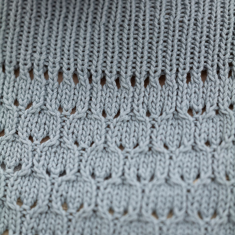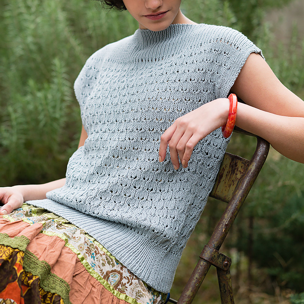 花のつぼみのようにも、水面に浮かぶ波紋にも見えるクールな透かし模様は、シンプルで覚えやすい記号の組み合わせ。ボートネックにフレンチスリーブの組み合わせは、サマーニットならではの上品で女性らしいニュアンスが味わえます。