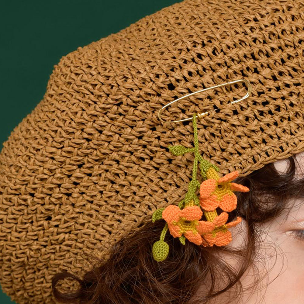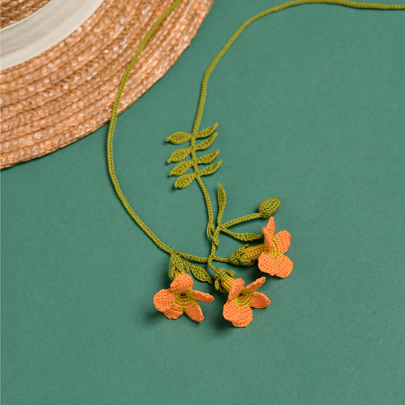 長く伸びたツルから大きな花弁がこぼれ落ちるように咲く美しい姿を、そのままネックレスに仕立てました。糸で編んでいるので軽い着け心地です。ネックレスの花をピン仕立てに。ノウゼンカズラの華やかなオレンジ色と落ち着いたグリーンの配色は、見ているだけで気持ちが明るくなります。