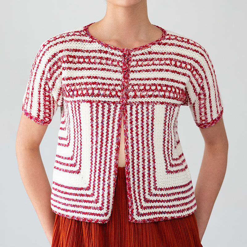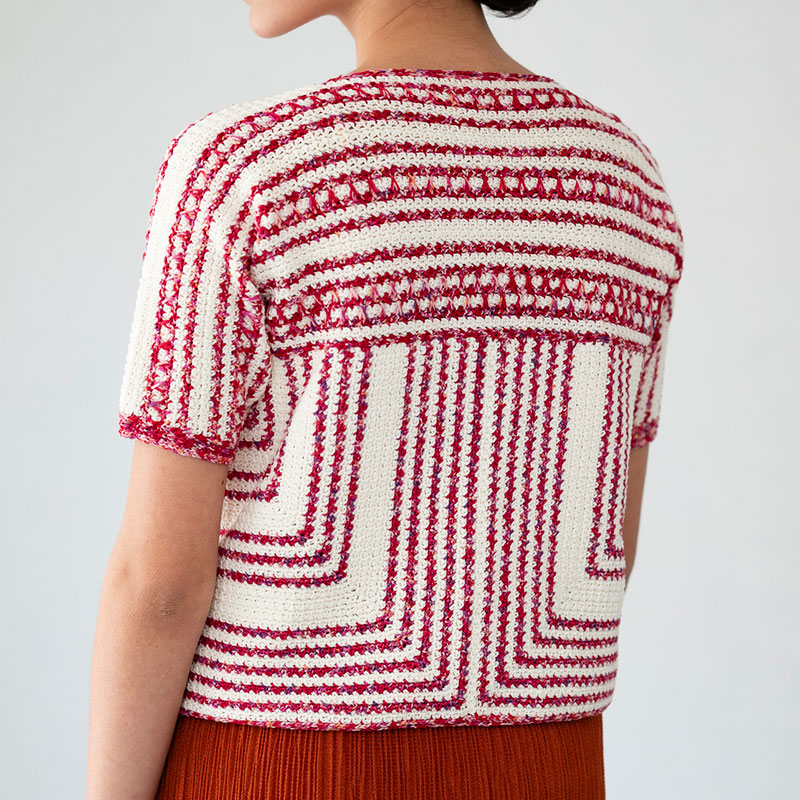 シンプルなボーダー模様を往復しながらU字に編み、さらに立体的な袖へと展開し ていきます。あとからとじはぎすることなくウエアが編め、編み地に適度な伸びが あるので着やすく動きやすいのも嬉しいポイント。