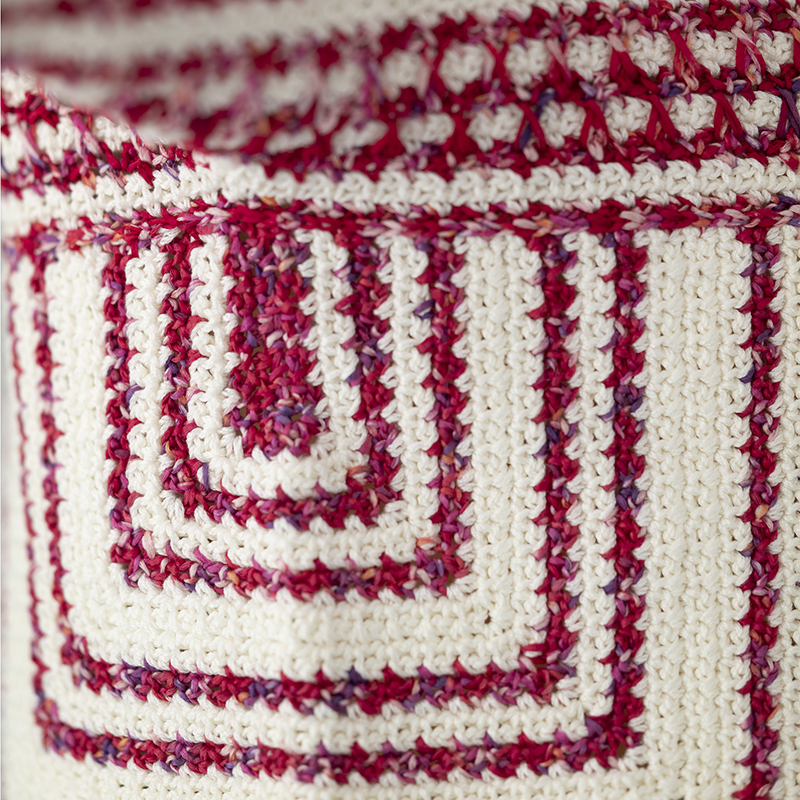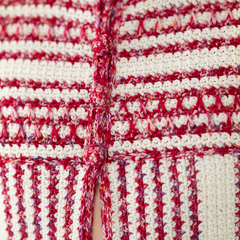 材料:パピー コットンコナ 生なり(2)225g/6玉。ザンビアプリント 赤系段染め(430)125g/3玉。直径15㎜のくるみボタンの中身4個。