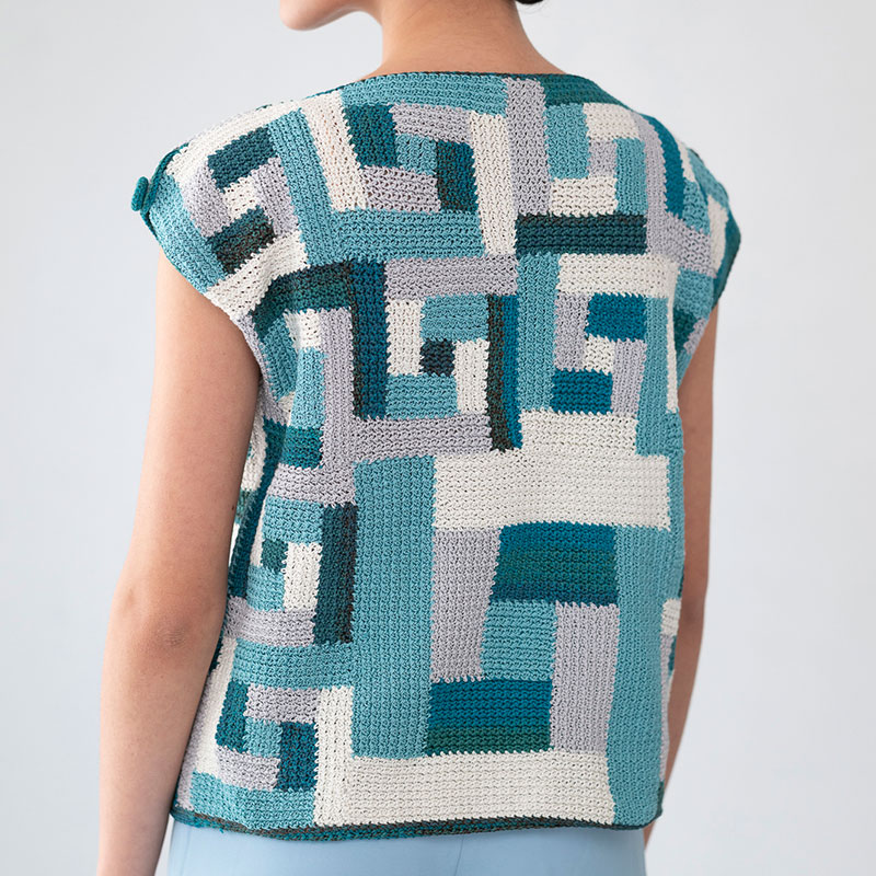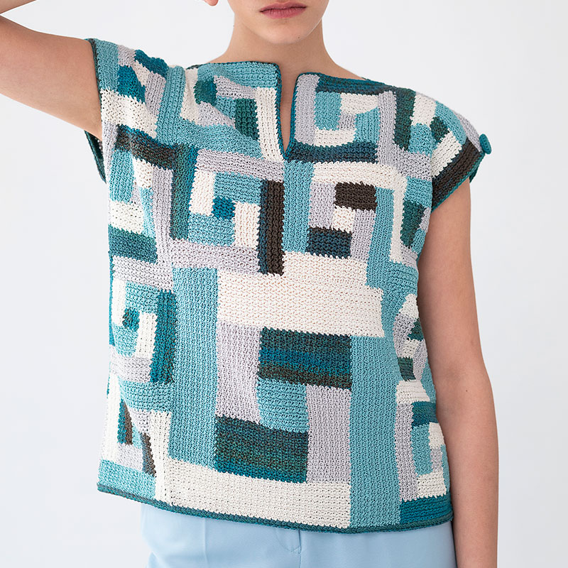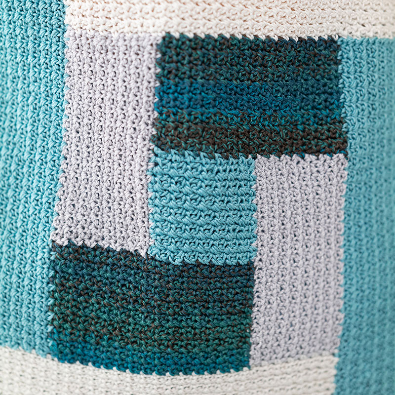 小さな正方形から編み始めて、まわりに長方形のブロックをぐるぐると編み、パッチワークのログキャビンのように編み広げていきます。ブロックの大きさは自由自在。小さなブロックと大きなブロックを組み合わせるのもグラフィカルで面白いです。