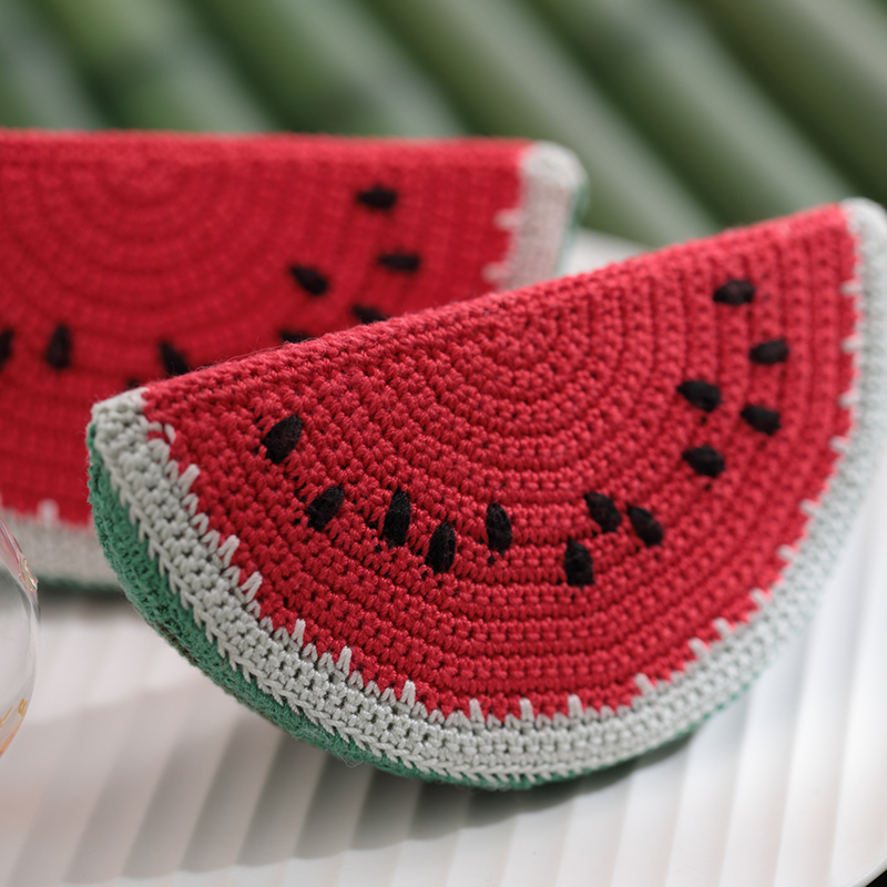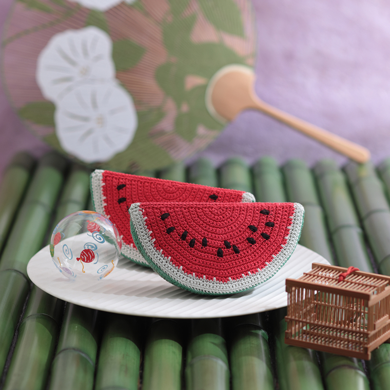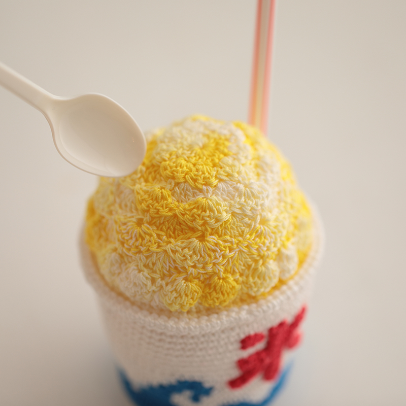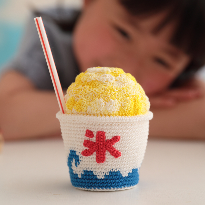 緑と黒のシマシマで真っ赤な顔のニクいヤツ、そして青い波頭に赤い「氷」の文字を思い浮かべてしまったら、 今すぐ食べたい! いや編みたい! ニッポンの夏にはこれがなくっちゃ!