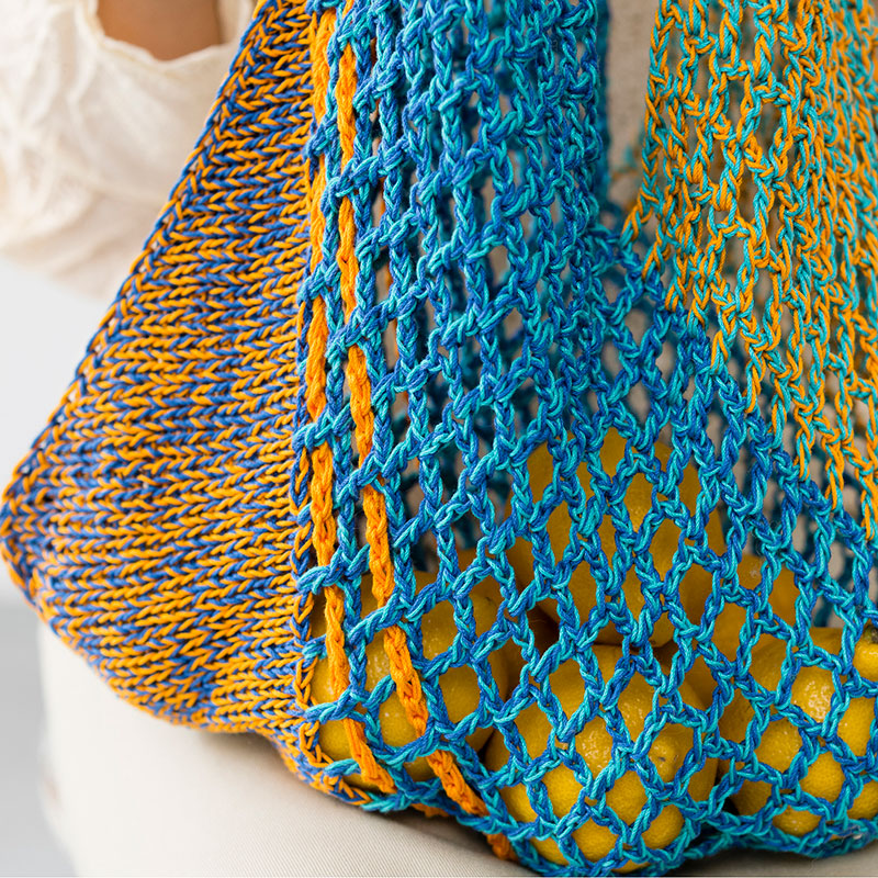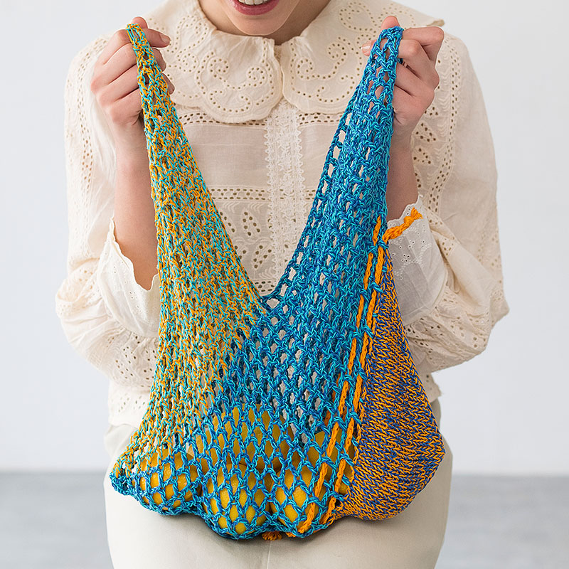 口の広いデザインが嬉しいエコバッグ。編み地にひもを通しておくことで、内側に折りたたんでキュッとまとめて収納することもできます!
