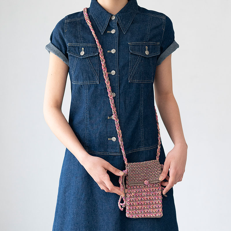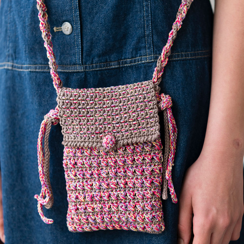 ボタンまで編んでいるので、糸だけで完 成します! 肩ひもは結ぶ位置を変えれば かんたんに長さの調節ができますよ。