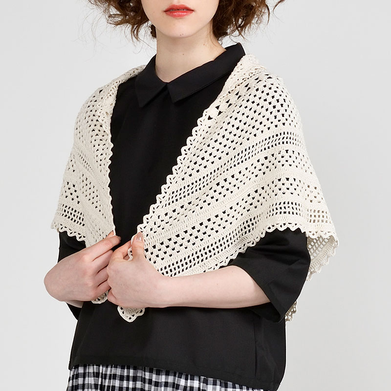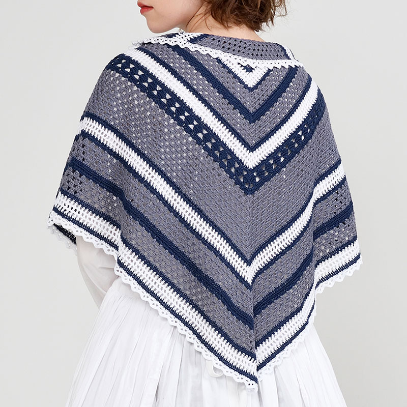 長編みベースに、松編みや方眼編みをランダムボーダーに配して変化を つけた、シンプルで美しい模様で編み進める三角ショール。単色とボーダー配色、色の違いで印象が変わります。ベーシックな大判サイズ。