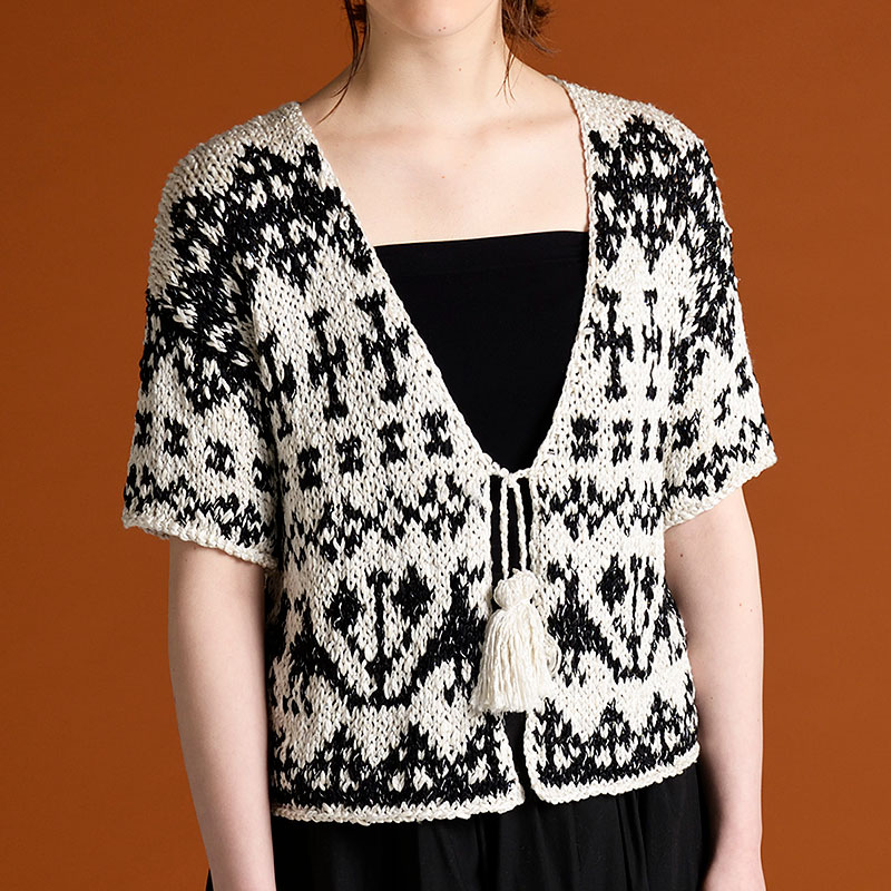 黒と白のドラマティックな配色で、夏にはちょっと珍しい編み込みを。ボレロジャケットは、ワンピースの上に羽織っても、スカートやパンツと合わせても決まりま