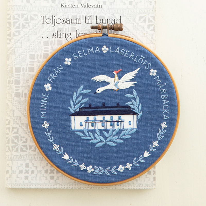 スウェーデンの「ゲフレ(GEFLE)」という陶器に描かれた、絵皿を刺しゅうで描きました。鮮やかなブルーのリネンも素敵です。刺しゅう枠つきのキットになります。