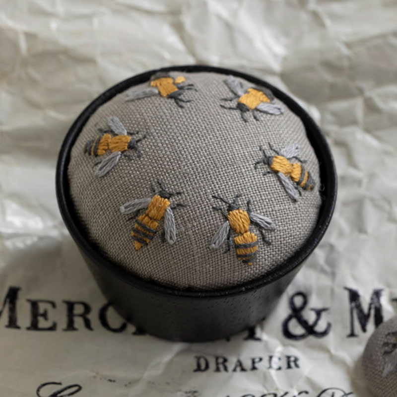中心に向かってミツバチが取り囲むデザインのピンクッション。刺しゅうをしたら、ウッドボウルに詰めるだけなので作りやすい作品です。
