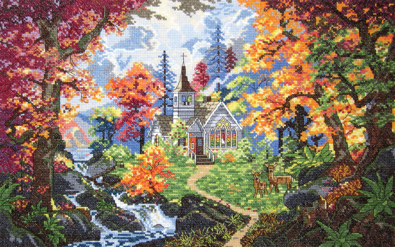 【キット作り方つき】せせらぎが流れる森の奥に、ひっそり佇む小さなチャペル。紅葉が美しいクロスステッチ作品です。上級の方向き。