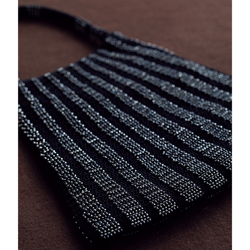 放射状にビーズが流れ、扇のような優雅な雰囲気に仕上がった バッグ。ビーズを長編みに3粒ずつ編み込みます。