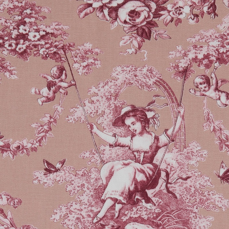 エンジェルや花々に囲まれてブランコに乗った女の子が描かれた、牧歌的で美しいこのファブリックは、トワル・ド・ジュイの中でも人気の高い生地です。280cm幅のインテリアファブリックを半幅にして1m単位でお届けします。