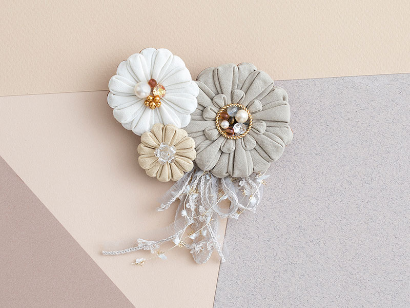 人気作家・つゆつきさんデザインのつまみ細工キット。3つのガーベラが花開くブローチ。丸裏返しの技法で作ります。スリムな花びらが幾重にも並んだ優しく端正な雰囲気が魅力的。同系色でまとめたお花は、どんな装いにもシックに引き立てます。カット済みの布が入っているので、すぐに作り始めることができます。