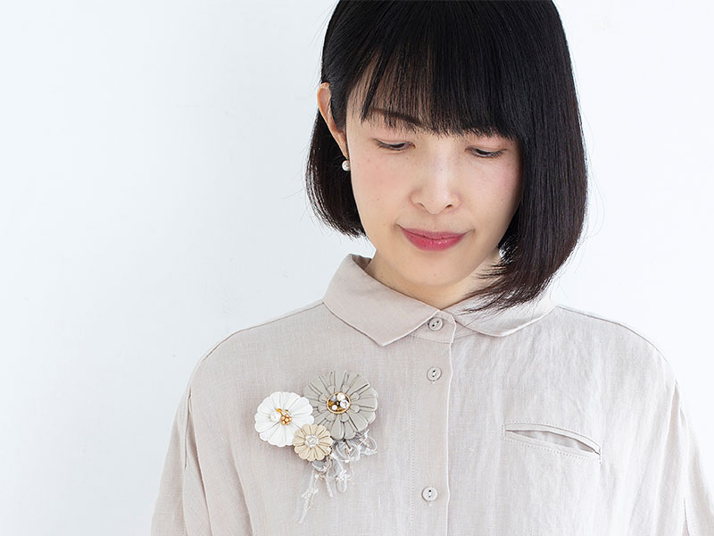 人気作家・つゆつきさんデザインのつまみ細工キット。3つのガーベラが花開くブローチ。丸裏返しの技法で作ります。スリムな花びらが幾重にも並んだ優しく端正な雰囲気が魅力的。同系色でまとめたお花は、どんな装いにもシックに引き立てます。カット済みの布が入っているので、すぐに作り始めることができます。
