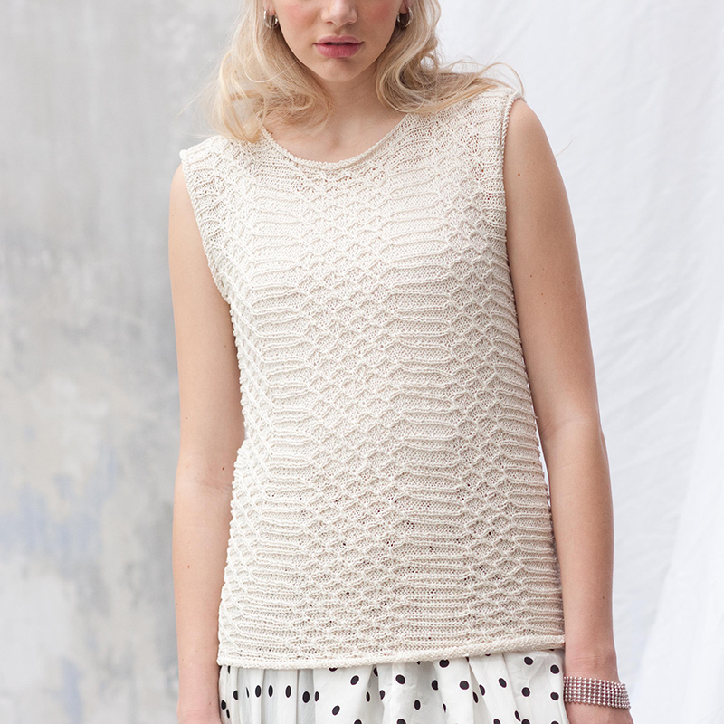 今シーズン流行のリネン素材で涼やかなスリーブレスにしました。控えめなラメ入りがお洒落です。一見スモッキング刺しゅうのように見える編地は横から糸を引き出して次の段で2目一度しながらダイヤに入れ、裏目の中に表目1目を浮き立たせた縞模様で全体に横編み使いにしました。回りのエッジはメリヤス編みの編みっぱなしにしてカジュアルな仕上げにしています。
