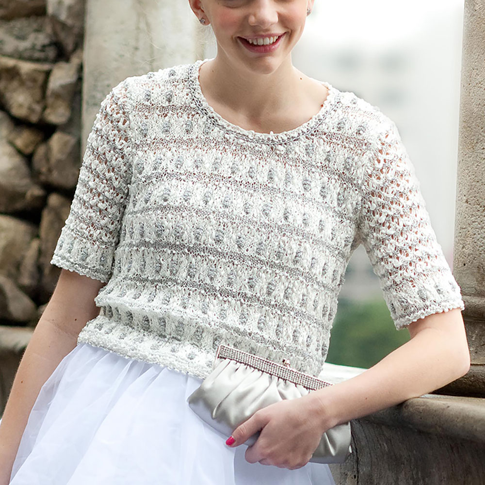 様々な表情の白ベースに銀ラメ、オーロラ・ラメを配した半袖のプル・手編みならではの表面効果が 美しく、ひと際映える夏のお洒落ニットです。