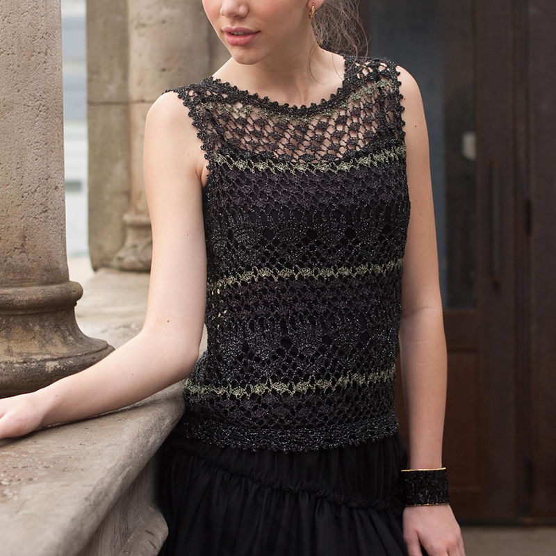 いろいろなパターンと素材を組み合わせたかぎ針あみのスリーブレス・プル。真夏の夜のパーティ・ウエアに是非用意しましょう。