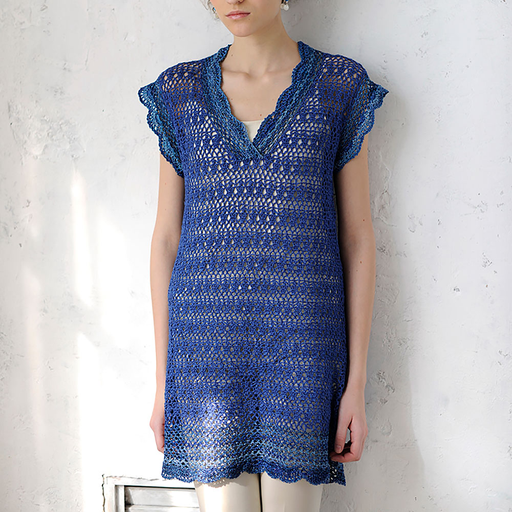 リネンとレーヨン混のリリヤーンをベースに編んだかぎ針あみのチュニック。縁回りに別素材でアクセントつけて。
