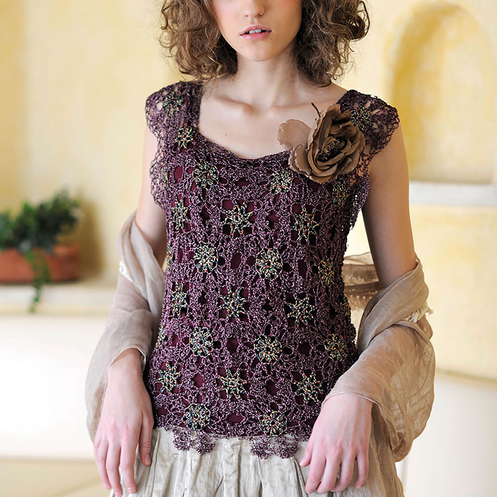 色味の違うラメ入りファンシーヤーンの芯モチーフに、回りを新感覚のピンク系ラメ糸で大きめのモチーフつなぎに編んだスリーブレス。夏の夜のパーティ・ウエアにぴったりの豪華な作品です。