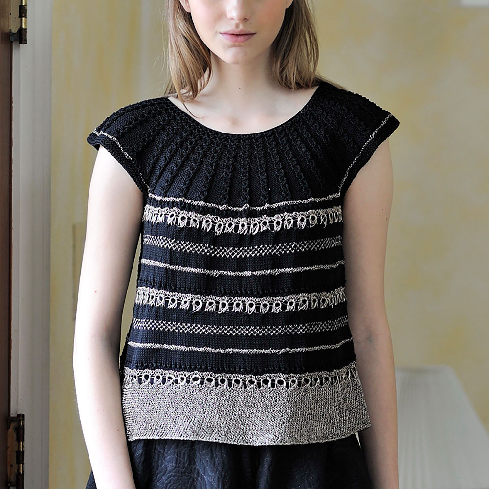 黒の上質コットン糸に、新感覚のゴールド・ラメをランダム・ストライプに配した丸ヨークのプルオーバー。ちょっとしたパーティー・ウエアにもなる華やかさです。