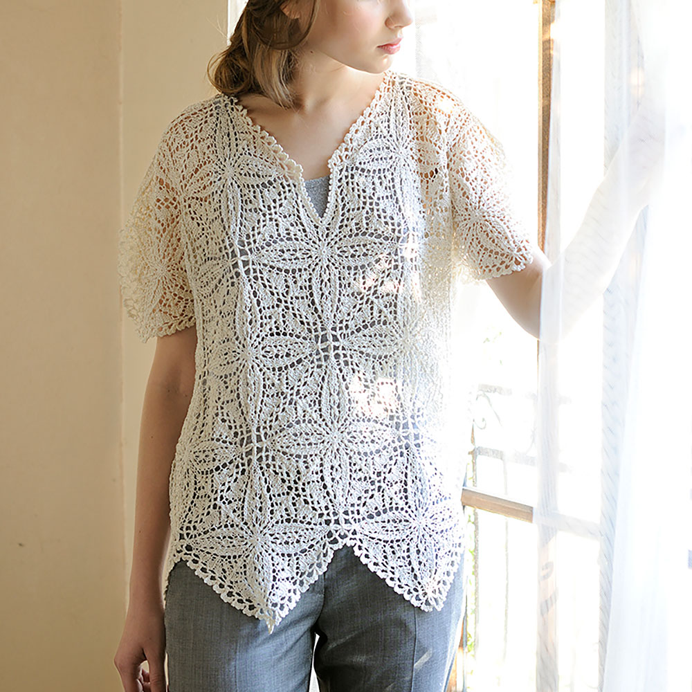 ラメの入ったシルクヤーンで丁寧に編み上げた、カジュアル感覚のプルオーバー。四角形のモチーフを斜めにつなぎ、裾と袖口の大きなジグザグがポイント。