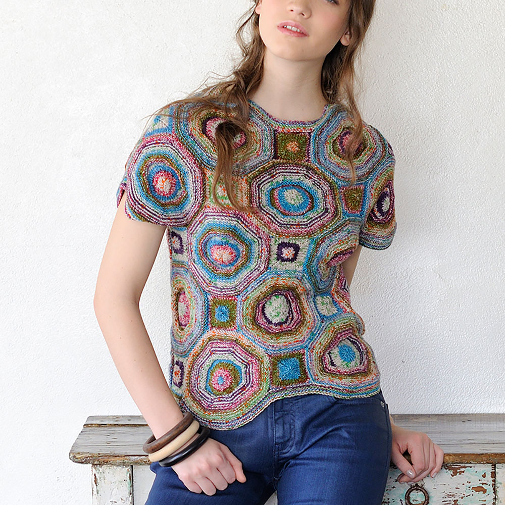 ロングピッチの段染め糸を使い、様々な色合いが楽しめるプルオーバー。八角形のモチーフは中心から編み、四角形モチーフは外回りから中心に向かって編みます。