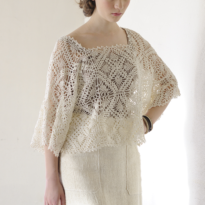 パイナップル模様の大きめモチーフを編みつないだプルオーバーは、風を羽織るように涼やかに着こなして。モチーフのバリエーションは同じ模様で素材と色を変化させました。
