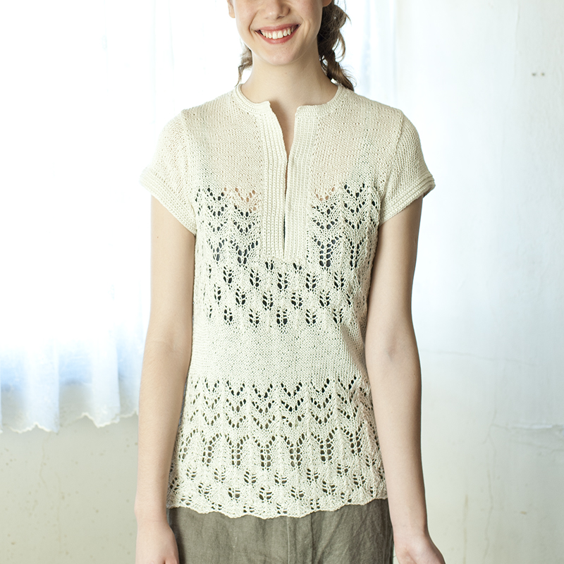 控えめなラメ感が上品なプチスリーブセーターはゲージ調整で自然なAラインに。リズミカルな透かし模様なら長め丈も軽やかです。