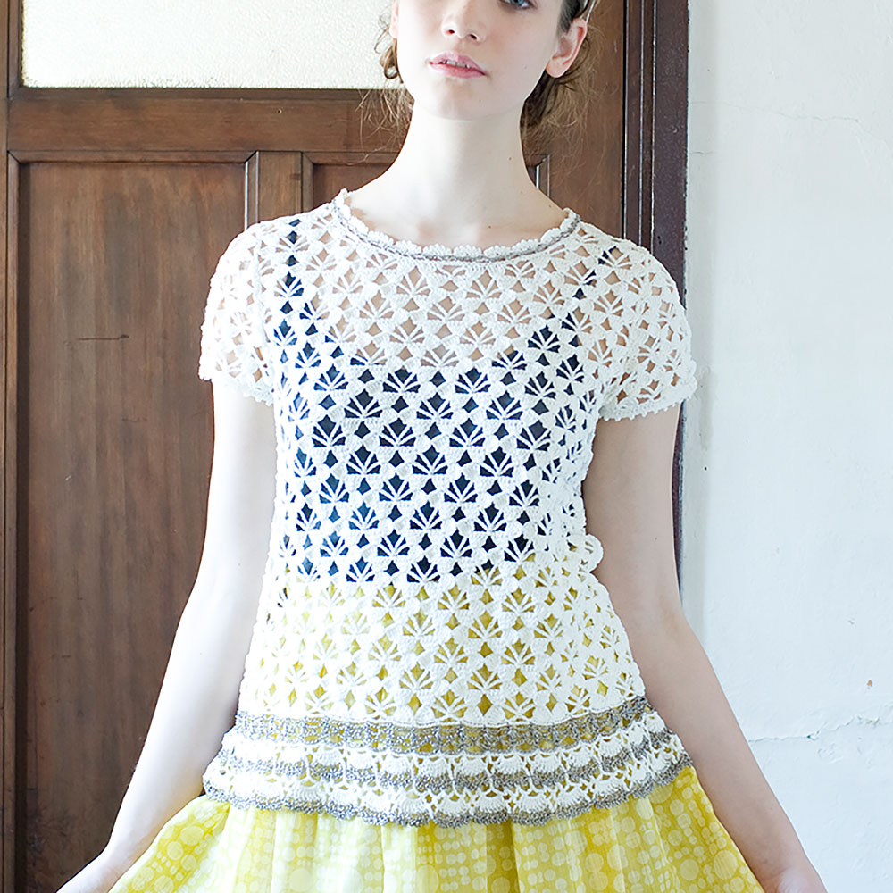 白いクロッシェフラワーが可憐な半袖プルオーバー。上質コットンをベースに、裾と衿にはメタリックなラインを編み入れ、特別感をプラス。