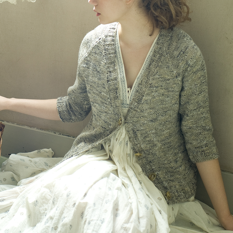 ゆったり着られるラグランスリーブの七分袖カーディガン。ロマンティックなワンピースに羽織ったり、パンツスタイルにもお似合いです。