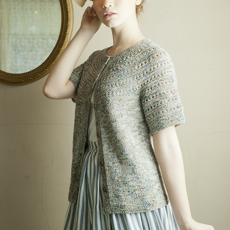 女性らしいシルエットが人気の丸ヨークカーディガンはやさしい透かし模様がリズミカル。衿ぐりから作り目をして編み下げています。