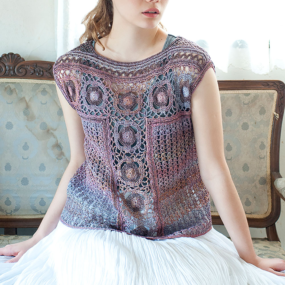 ヨークと身頃のセンターにモチーフをはめ込んだノースリーブプルオーバー。上品なパープルの段染めはどこか神秘的な雰囲気を醸し出します。