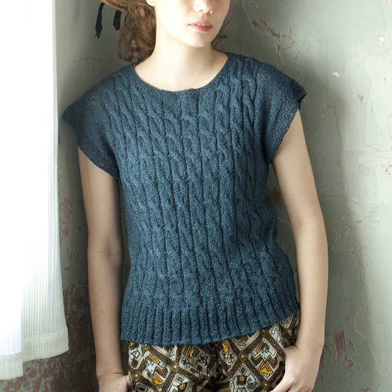 ケーブル模様のプルオーバーはしなやかな肌触りのリネン素材で。スモーキーなネイビーは派手柄のボトムスも大人の表情にします。