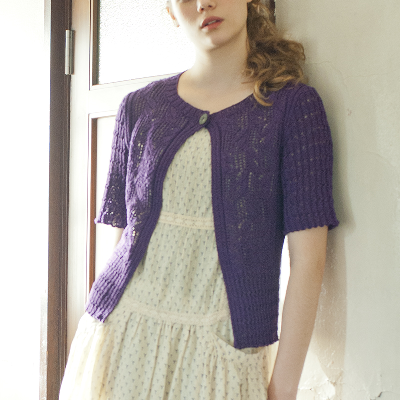 数パターンの透かし模様を組み合わせたワンボタンカーディガン。脇に配したリブ編みが自然に添ってボディラインをきれいに見せます。