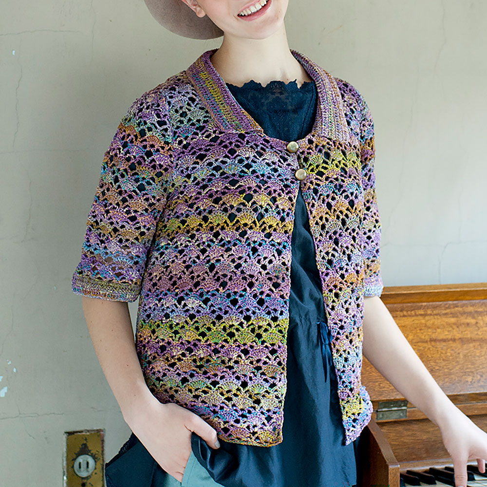 小さな扇形模様が色とりどりのモザイクのように映るきれい色のサマージャケット。衿をつけてよそゆき感のあるおしゃれなデザインに。