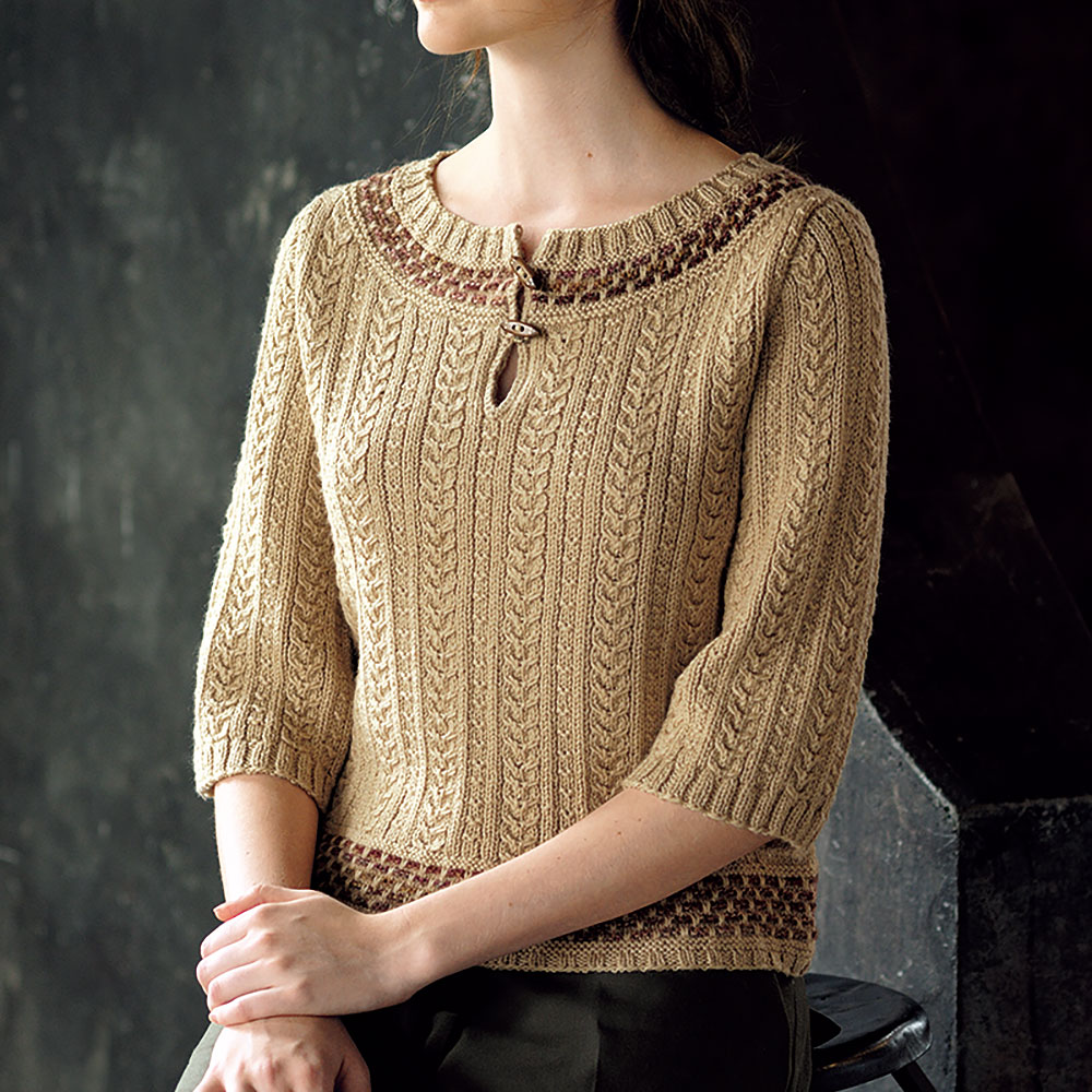 裾と衿ぐりに入れた配色模様がアクセントの6分袖のプルオーバー。前に入れたスリットあきが優しい雰囲気を醸し出しています。