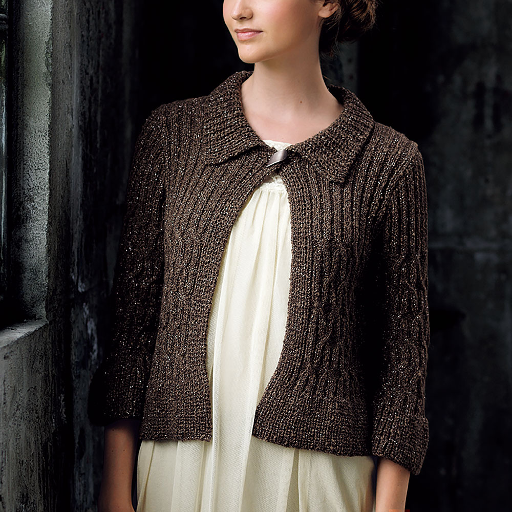 シルクの光沢とモヘヤとラメが醸し出すお洒落な糸で編んだワンボタンの衿付きジャケット。リブ編みを変化させてシルエットを表現しています。