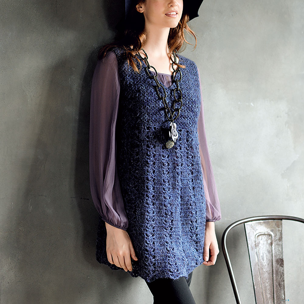 人気のかぎ針あみのチュニック・ベスト。アンダーバストで切り替えて上下に編みます。下のスカート部分は長編み部分で分散増し目しながら裾を広げます。長めの丈がうれしい。
